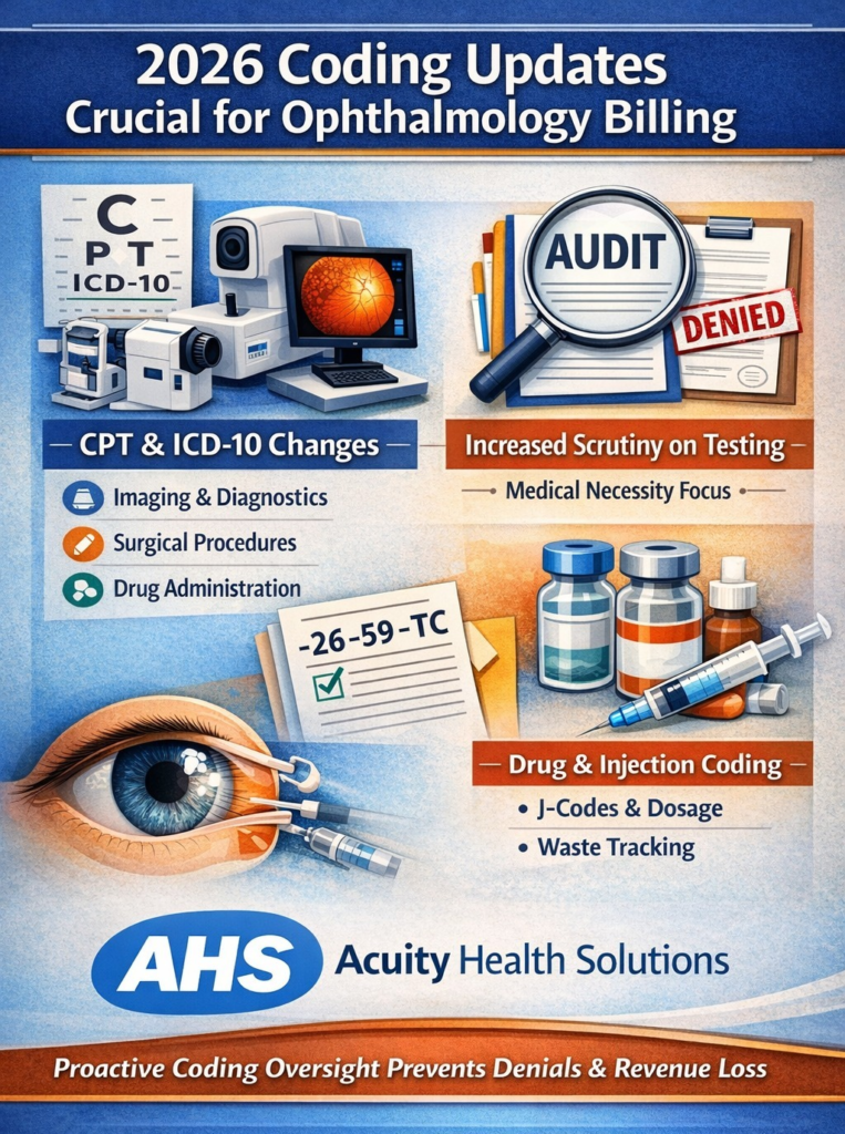 Acuity Health Solutions assists eye clinics to manage the changes in 2026 and mid the codes by specialty-specific coding supervision, payer-based workflow, and strategic prevention of denials.