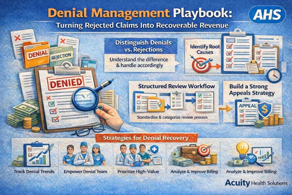An effective denial management playbook to assist healthcare organizations in determining the underlying causes, loss of revenue, and elimination of repetitive claim errors. In Acuity Health Solutions, denial management is considered an active revenue cycle operation and not an administrative reactive action.