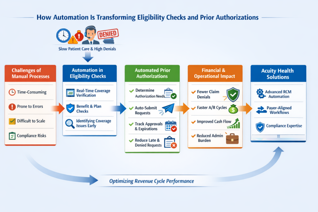 Acuity Health Solutions assists the practices to take a strategic advantage of automation, which is combining technology with payer-aligned workflow and qualified management. Risk cannot be eradicated through automation, but a combination of a powerful process design and compliance expertise, it would prove to be a potent tool in protecting the revenue.