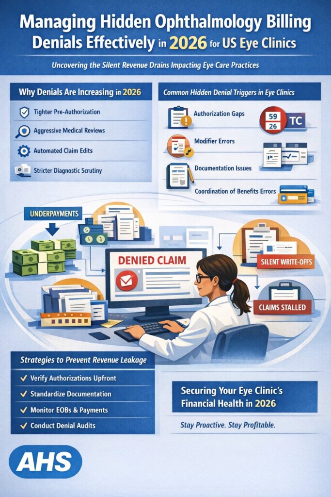 Hidden billing denials remain a challenge that is only increasing in Ophthalmology practices across the U.S. These rejections, as opposed to the obvious ones, tend to take the lower forms of underpayments or silent write-offs or even claims that stall down unnecessarily. To eye clinics that are employing narrow margins, such hidden sources of leaks can silently undermine the profitability.