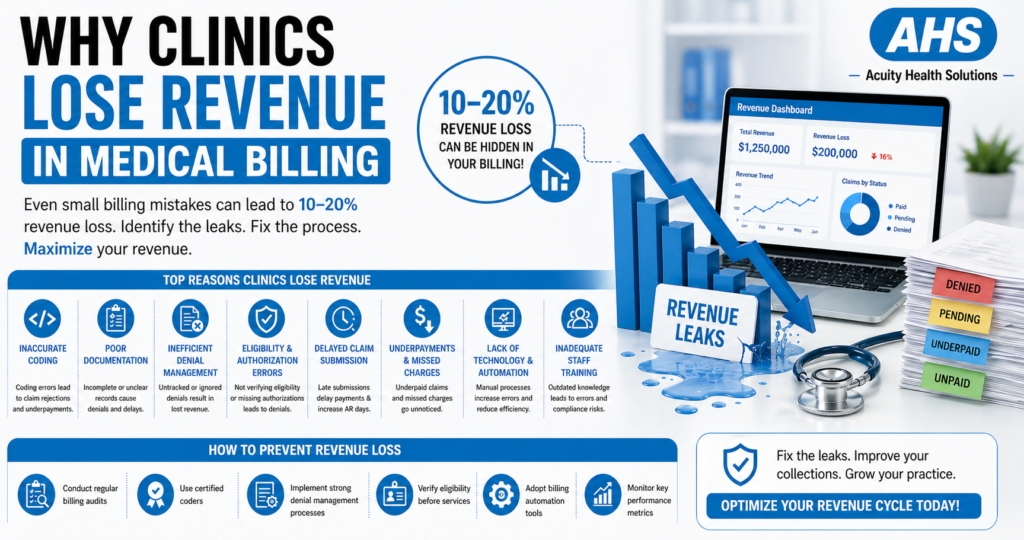 Revenue loss in the Medical Billing itself is very common and most of the clinics hardly realize. Problems with billing can result in between 10–20% revenue loss even for well established practices. Everything from coding errors to slow follow-up can quickly accumulate and cause considerable financial loss. The first step towards a strong and profitable revenue cycle is understanding the leaks in your system that are preventing you from maximising revenue.